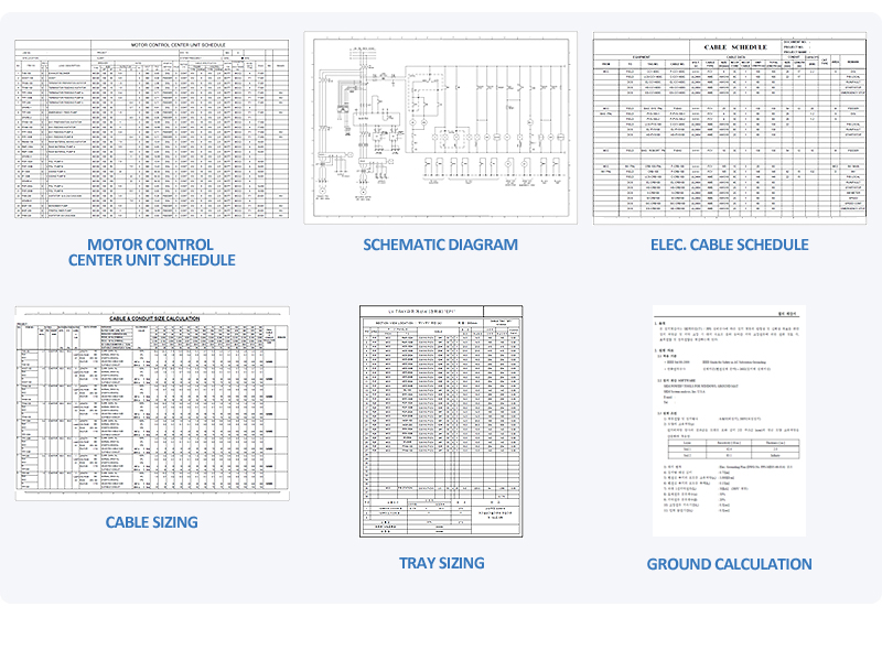 (Tray, Power, Grounding, Lighting Layout, Cable schedule, Connection dwg)각종 계산서 (Tray, Grounding, Lighting, 고장전류, 보호계전기 정전계산 및 보호협조, Cable Sizing)작성 및 공사용 BM산출 등을 수행합니다.